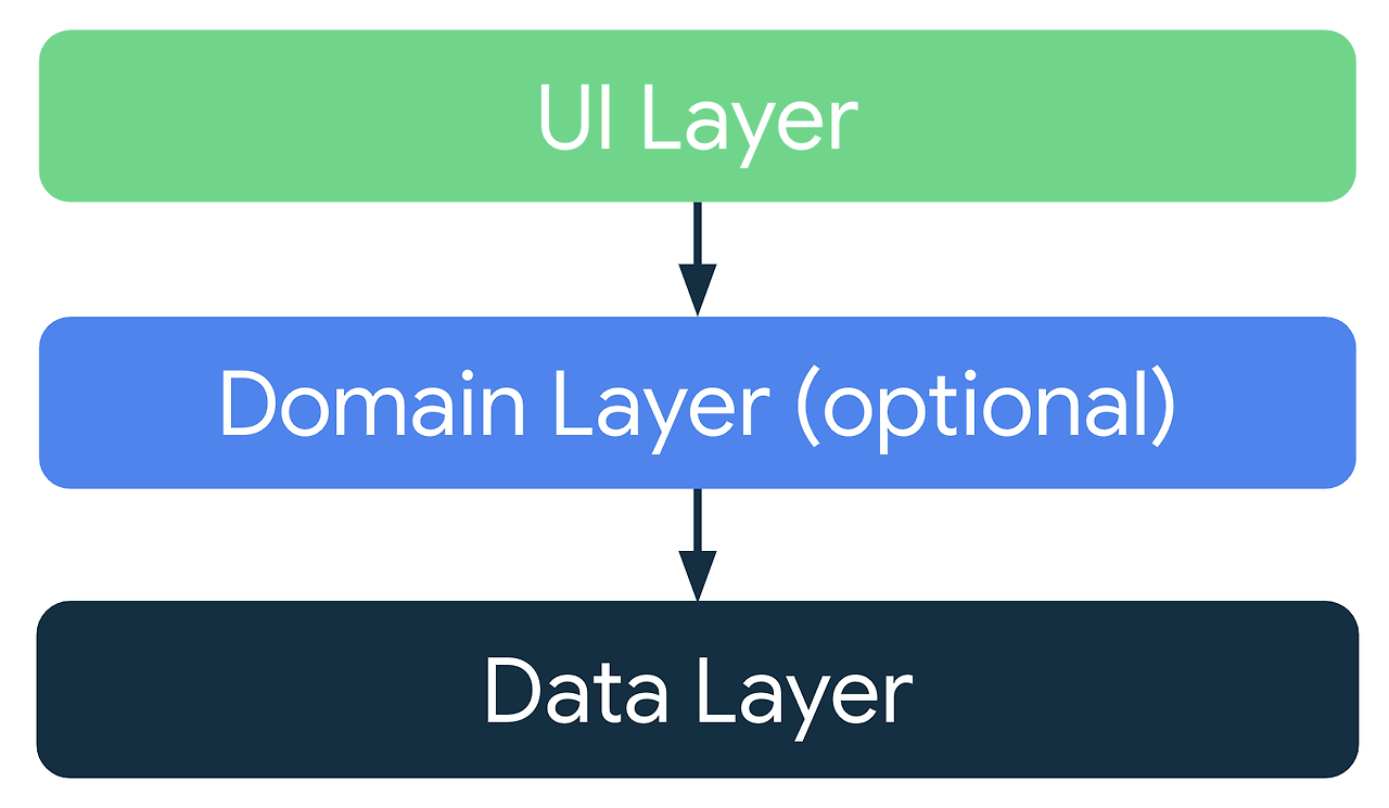 Flutter 공식 문서에서는 앱을 UI Layer와 Data Layer로 나누고, 필요에 따라 중간 레이어인 Domain Layer를 추가하여 복잡한 로직을 분리할 수도 있습니다.