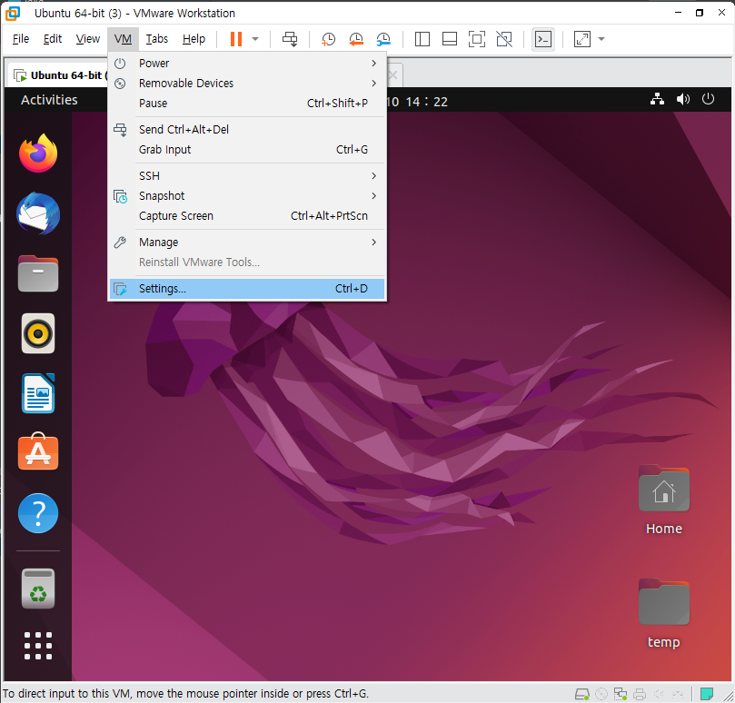 1. 상단의 메뉴 바 중 VM을 클릭한 후, Settings에 들어간다.