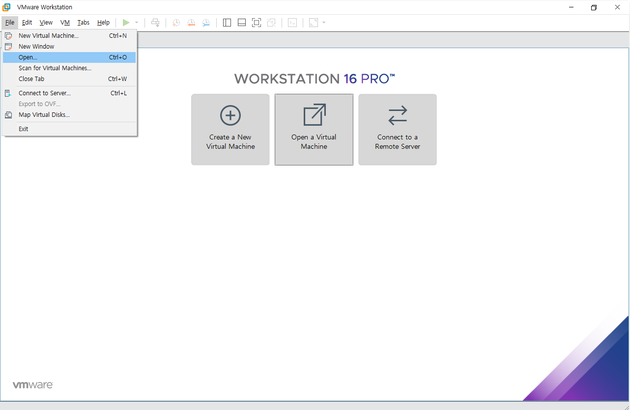 5. VMware에 들어가 Open a Virtual Machine을 클릭