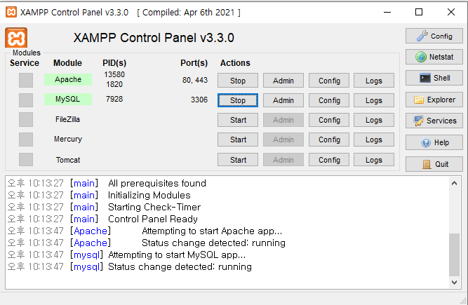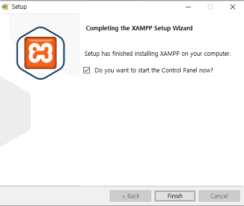 설치를 마치고 Finish를 클릭하면 바로 XAMPP 창이 뜹니다.