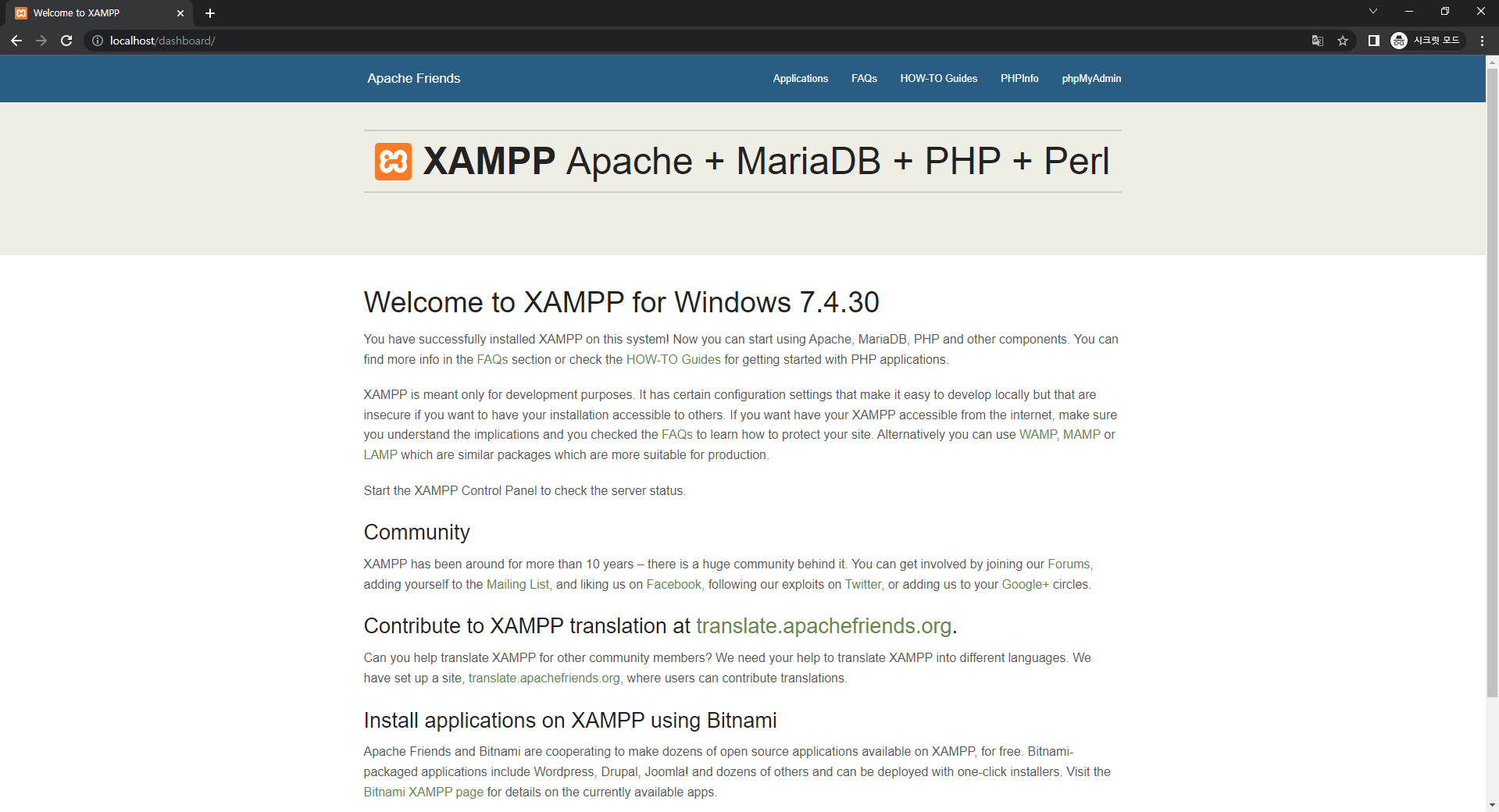 그 후, 검색창에 localhost를 검색하고 다음과 같은 창이 나오면 성공입니다 !