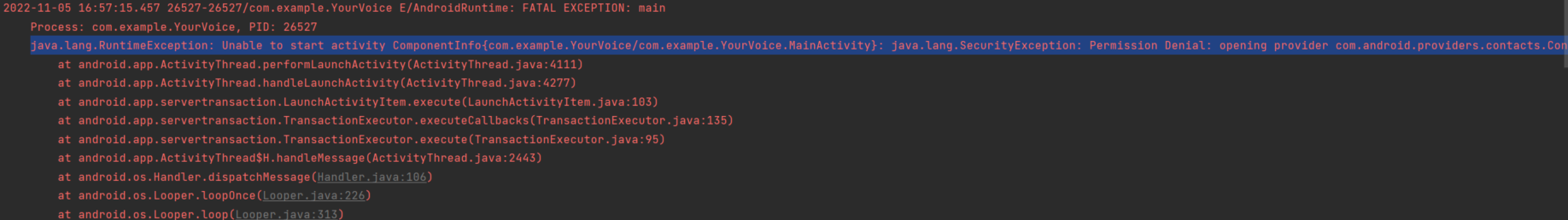 java.lang.RuntimeException: Unable to start activity ComponentInfo{com.example.YourVoice/com.example.YourVoice.MainActivity}: java.lang.SecurityException: Permission Denial: opening provider com.android.providers.contacts.ContactsProvider2 from ProcessRecord{b04300a 26527:com.example.YourVoice/u0a706} (pid=26527, uid=10706) requires android.permission.READ_CONTACTS or android.permission.WRITE_CONTACTS
