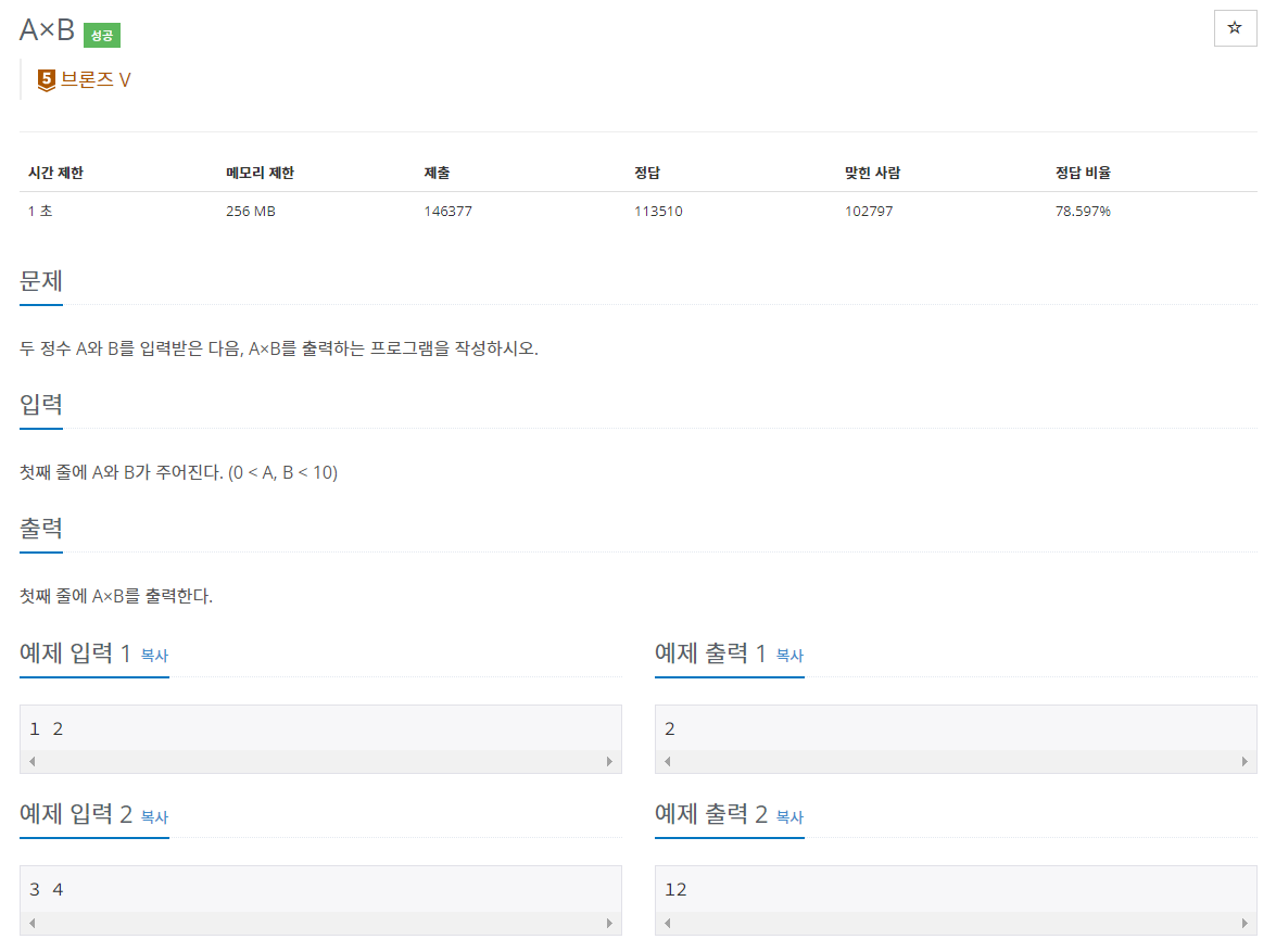두 정수 A와 B를 입력받은 다음, A×B를 출력하는 프로그램을 작성하시오.