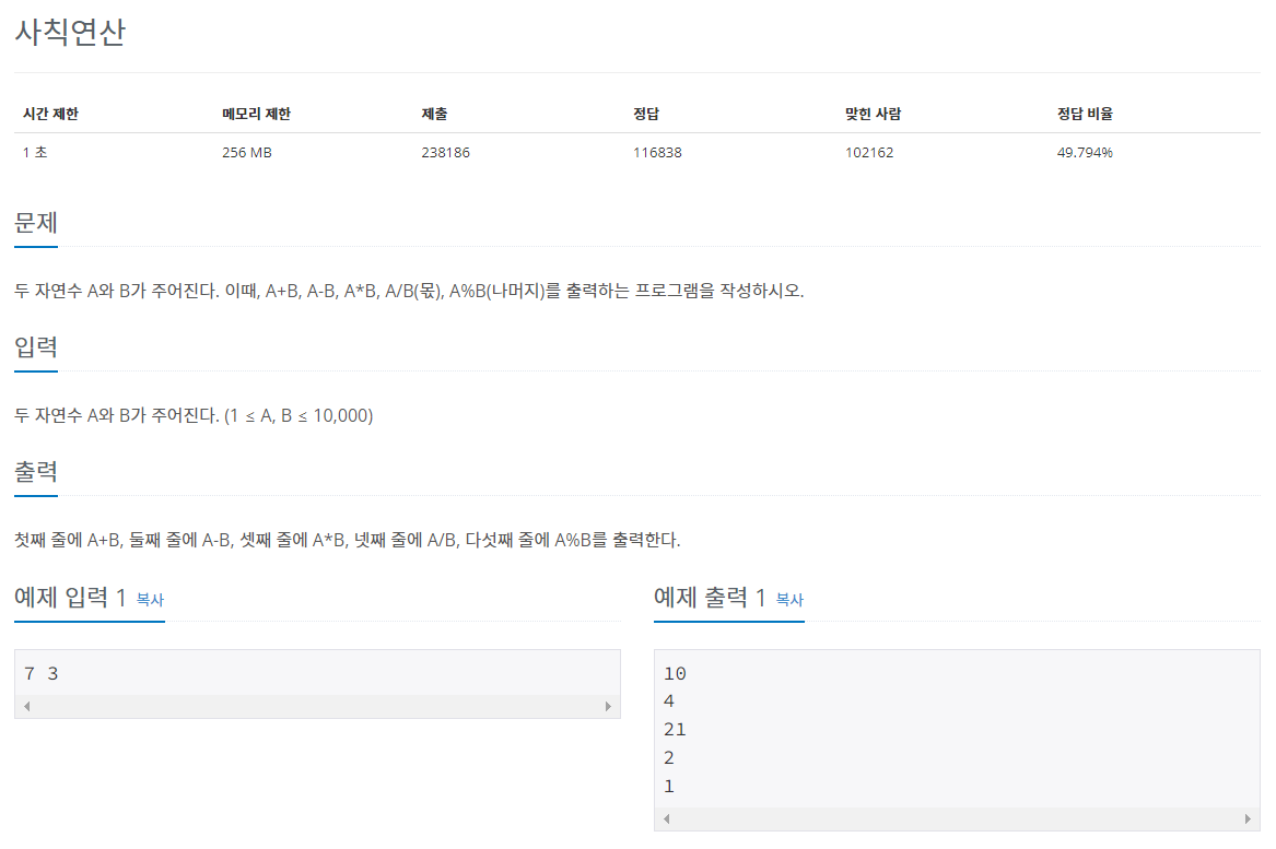 두 자연수 A와 B가 주어진다. 이때, A+B, A-B, A*B, A/B(몫), A%B(나머지)를 출력하는 프로그램을 작성하시오.