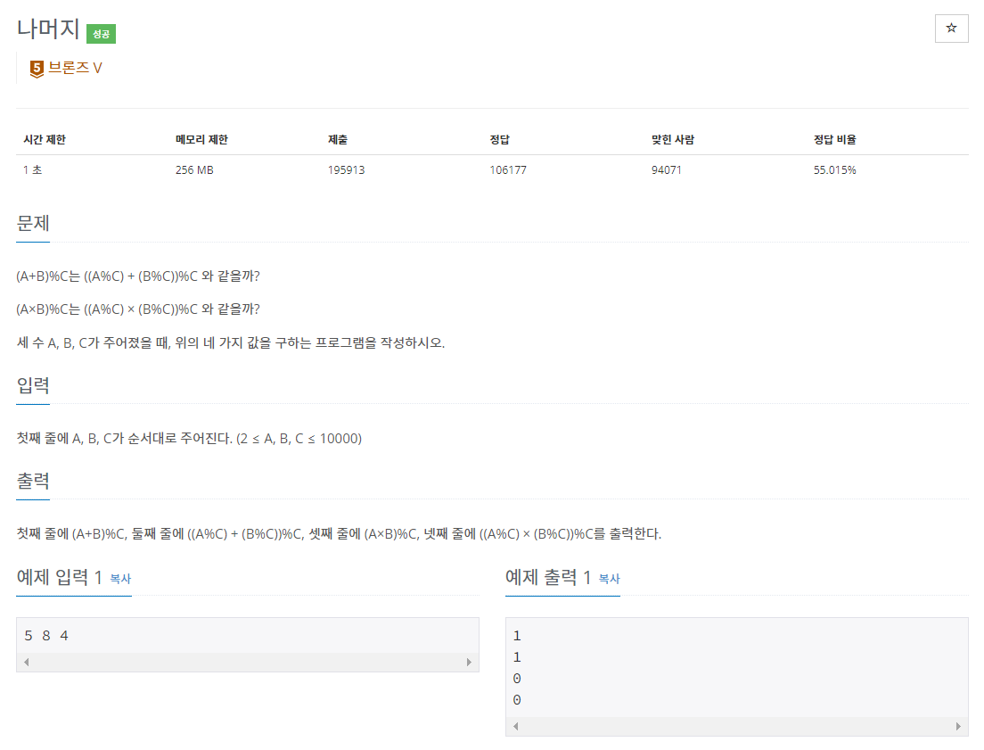 print((a+b)%c, ((a%b)+(b%c))%c, (a*b)%c, ((a%c)*(b%c))%c, sep='\n')