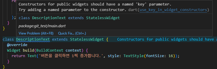 번역하면 public widget의 생성자에는 'key'라는 이름의 named parameter가 있어야 한다고 합니다.